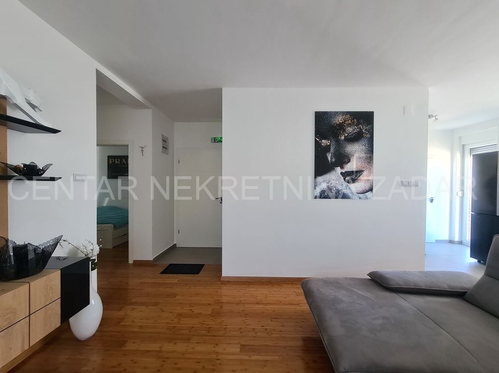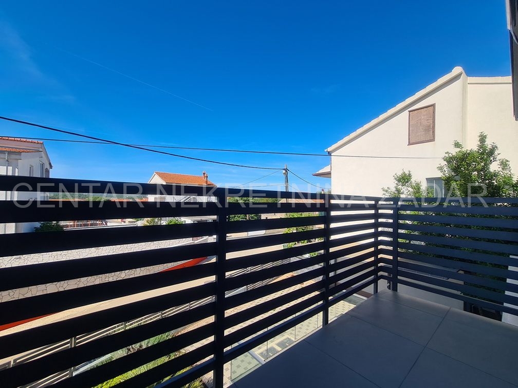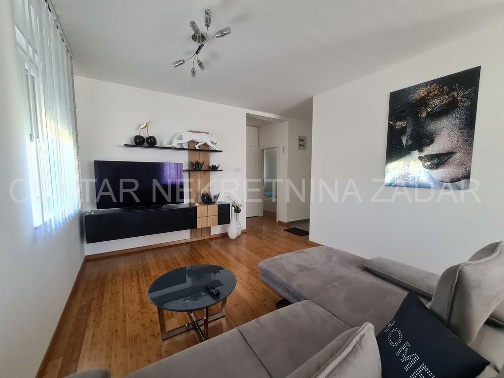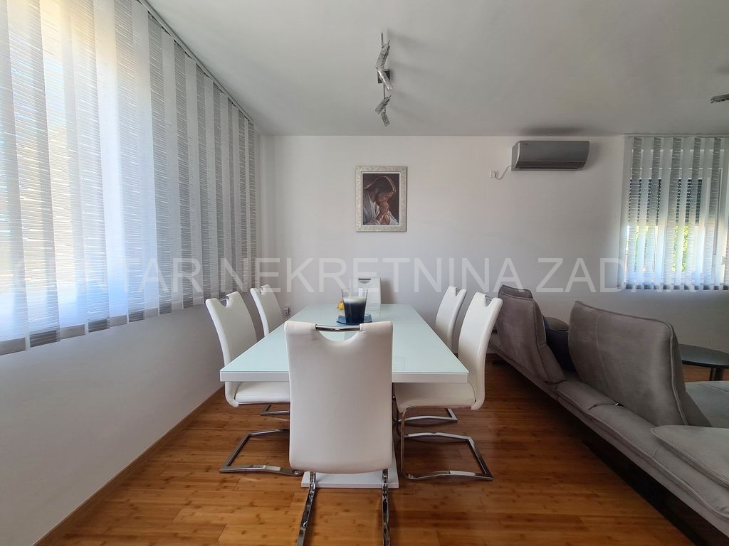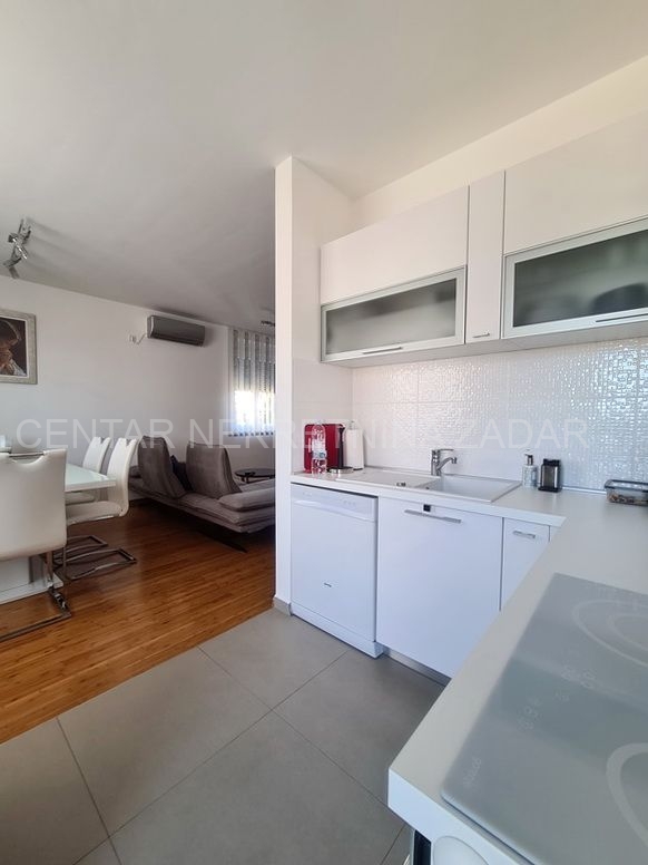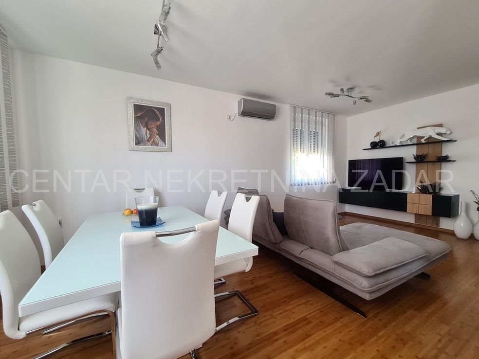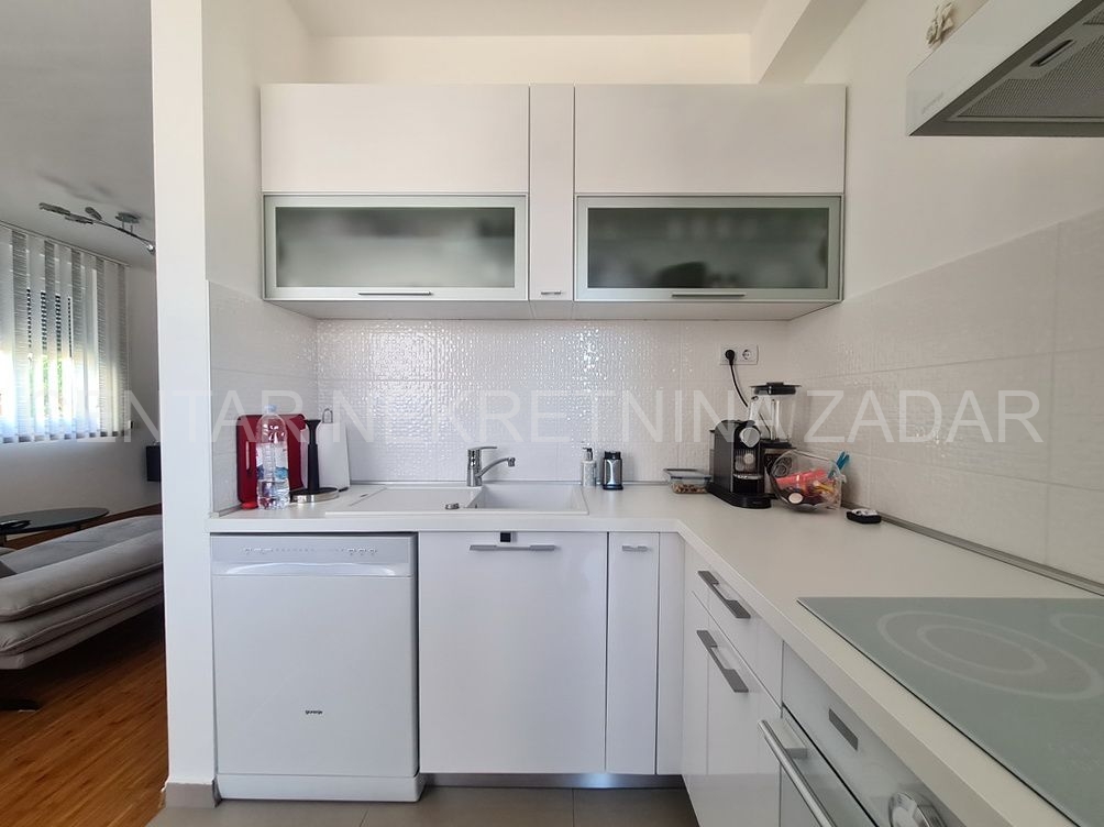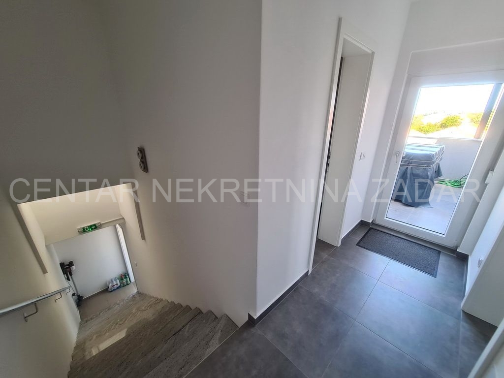 Prodaje se trosobni stan na vrhunskoj lokaciji u Turnju, nedaleko od Sv. Filipa i Jakova. Stan je dvoetažan i nalazi se na prvom i drugom katu zgrade. Prizemlje i prvi kat zgrade građeni su 2010. godine, a potom je 2020. godine, nakon što je zatražena dozvola, nadograđen drugi kat. Stan ima oko 152 m2 podne površine, te ima ulaz u prizemlju zgrade koji je odvojen od ostalih stambenih jedinica (što znači da mu pripada i stepenište koje vodi iz prizemlja na kat). Stan se sastoji dakle od stepeništa u prizemlju; hodnika, kupaonice, dvije spavaće sobe, kuhinje s blagovaonicom i dnevnom sobom te terasom na prvom katu te još jedne kupaonice, spavaće sobe, dnevne sobe i velike krovne terase na drugom katu. Stan je namješten i opremljen vrlo kvalitetnim namještajem i uređajima te se kao takav prodaje. Na krovnoj terasi nalazi se i ljetna kuhinja te jacuzzi. S krovne terase, ali i iz stana pruža se prekrasan pogled na more. Grijanje i hlađenje je osigurano s klimom, a proveden je i dimnjak koji se nalazi u dnevnoj sobi pa postoji mogućnost grijanja na drva. U dvorištu zgrade nalazi se parking (od 37 m2) koji pripada stanu gdje je moguće parkirati čak tri automobila.