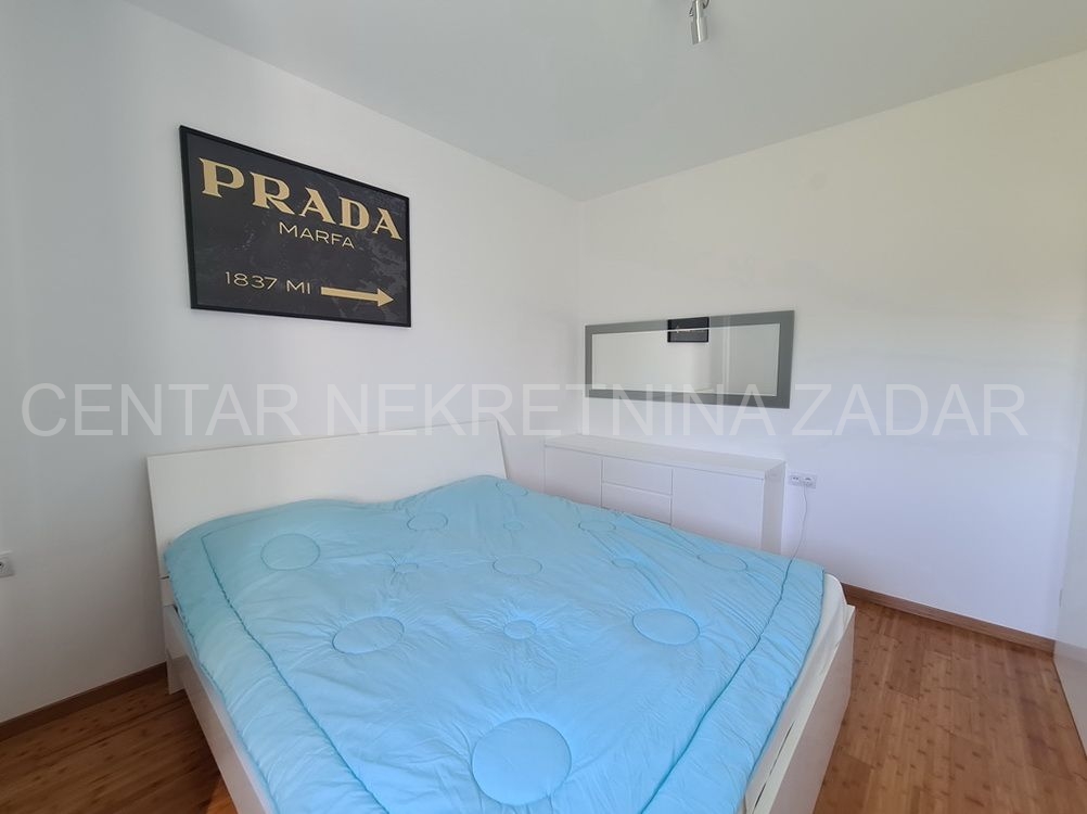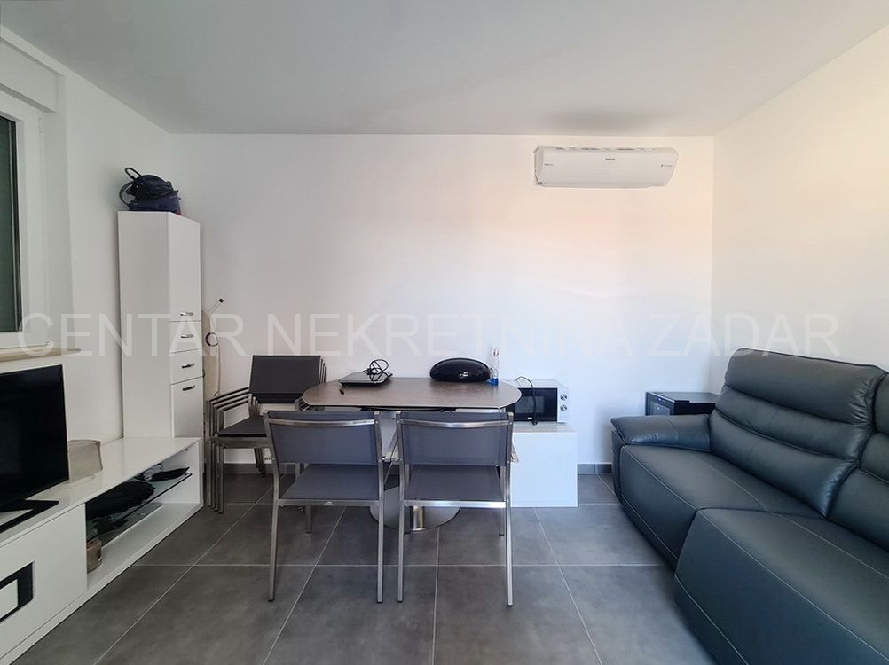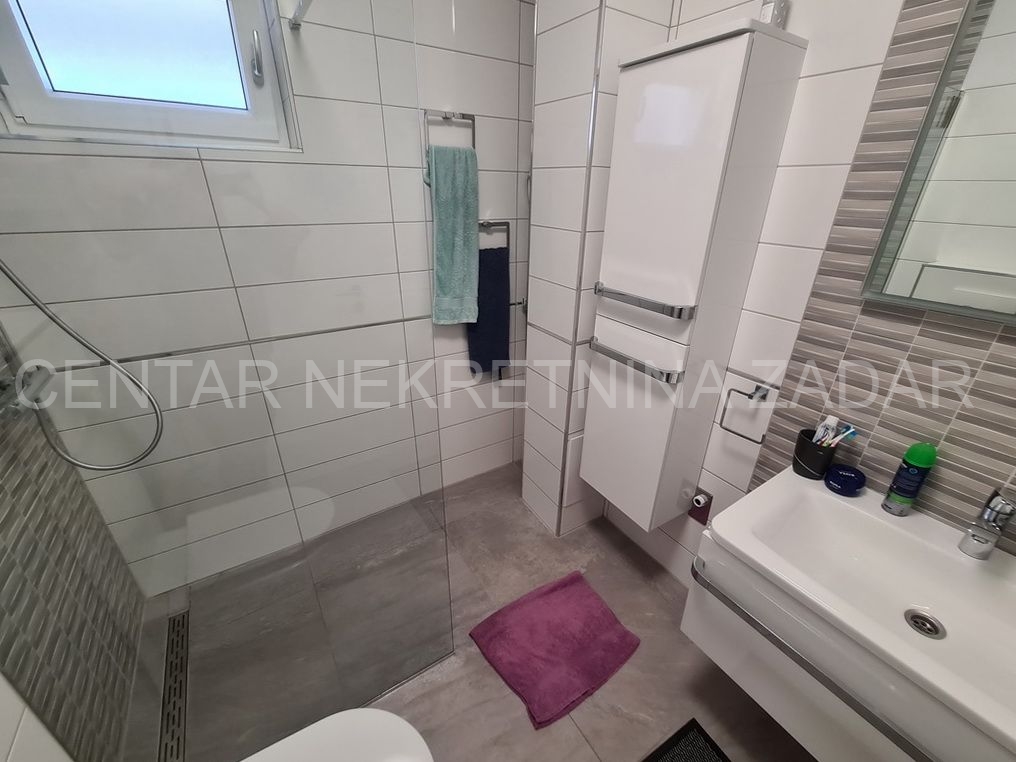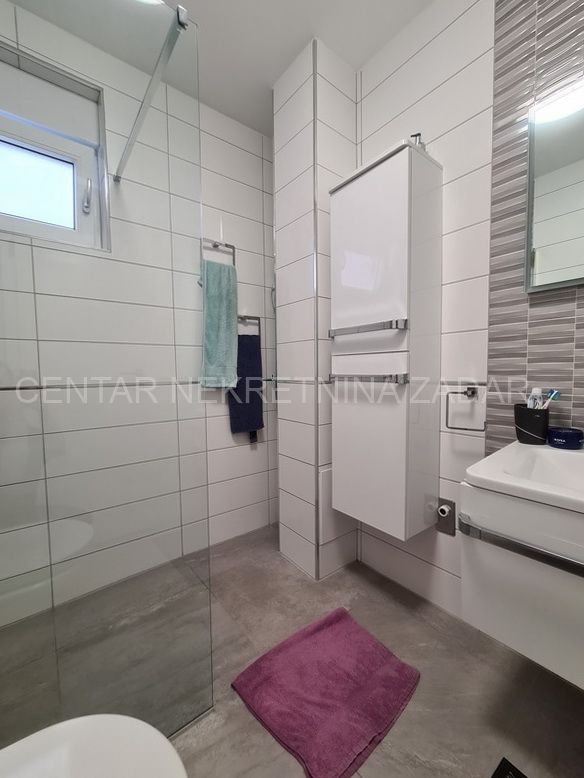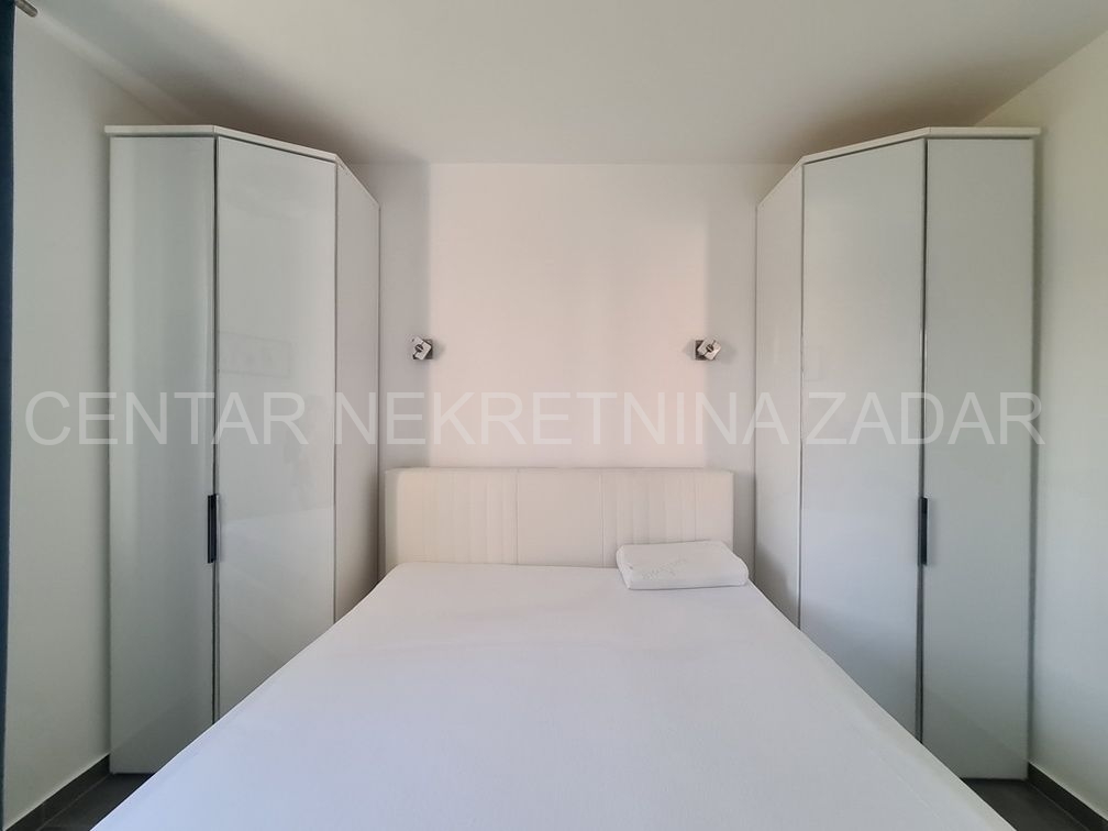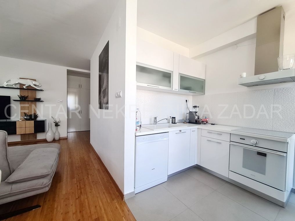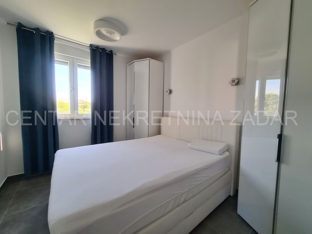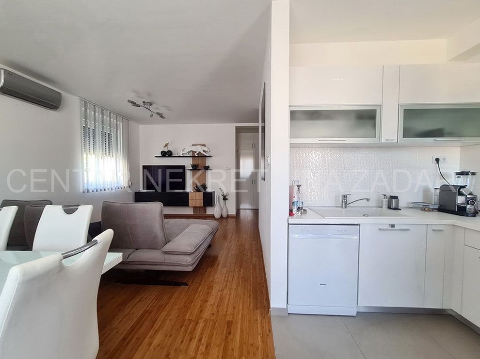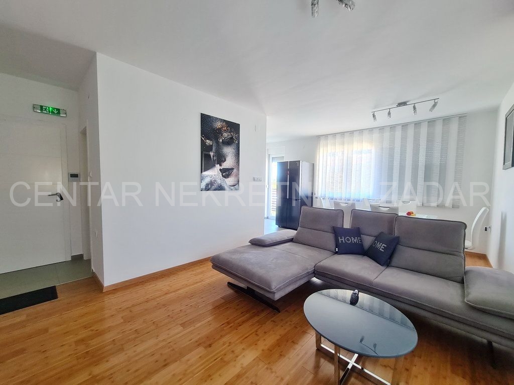 Prodaje se trosobni stan na vrhunskoj lokaciji u Turnju, nedaleko od Sv. Filipa i Jakova. Stan je dvoetažan i nalazi se na prvom i drugom katu zgrade. Prizemlje i prvi kat zgrade građeni su 2010. godine, a potom je 2020. godine, nakon što je zatražena dozvola, nadograđen drugi kat. Stan ima oko 152 m2 podne površine, te ima ulaz u prizemlju zgrade koji je odvojen od ostalih stambenih jedinica (što znači da mu pripada i stepenište koje vodi iz prizemlja na kat). Stan se sastoji dakle od stepeništa u prizemlju; hodnika, kupaonice, dvije spavaće sobe, kuhinje s blagovaonicom i dnevnom sobom te terasom na prvom katu te još jedne kupaonice, spavaće sobe, dnevne sobe i velike krovne terase na drugom katu. Stan je namješten i opremljen vrlo kvalitetnim namještajem i uređajima te se kao takav prodaje. Na krovnoj terasi nalazi se i ljetna kuhinja te jacuzzi. S krovne terase, ali i iz stana pruža se prekrasan pogled na more. Grijanje i hlađenje je osigurano s klimom, a proveden je i dimnjak koji se nalazi u dnevnoj sobi pa postoji mogućnost grijanja na drva. U dvorištu zgrade nalazi se parking (od 37 m2) koji pripada stanu gdje je moguće parkirati čak tri automobila.
