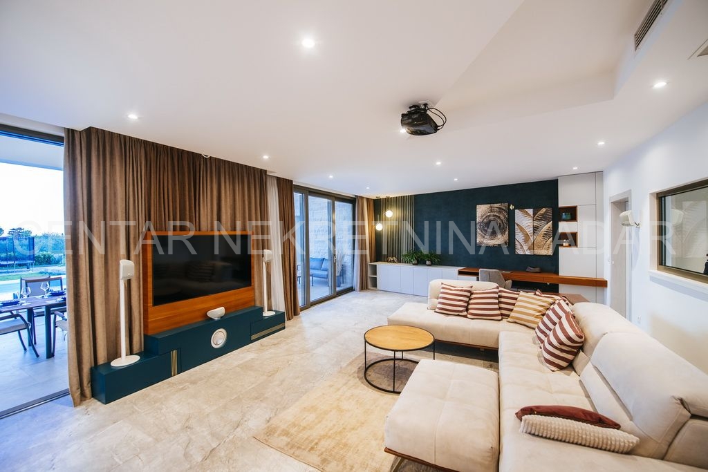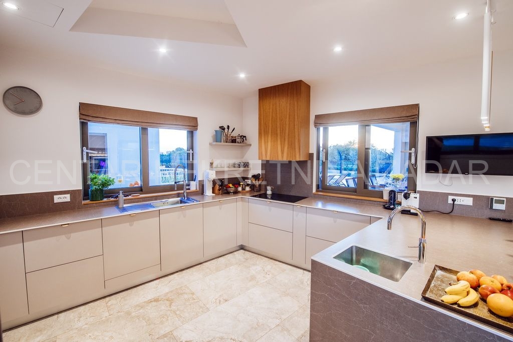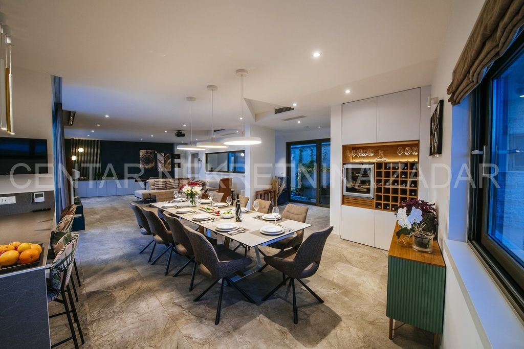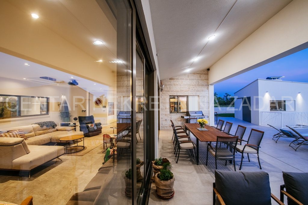 Na prodaju je jedinstvena novoizgrađena, moderno opremljena luksuzna vila sa bazenom u naselju Smoković, nedaleko Zadra. Izgrađena je na zemljištu ukupne površine 2850 m2. Ukupna stambena površina iznosi 276 m2, ima prostranu kuhinju, blagovaonicu i dnevni boravak, wc, praonicu te ukupno 5 spavaćih soba s vlastitim kupaonicama, opremljenim skupocjenom keramikom i sanitarijama te pomno odabranim namještajem izrađenim po mjeri. Dnevni boravak ima izlaz na veliku terasu pored bazena dimenzija 11x5, gdje se također nalazi vanjski tuš, jacuzzi te prostor za zabavu. Ispod bazena smještena je strojarnica bazena, a u sklopu tog prostora može se urediti i sauna ili teretana. Pored bazena nalazi se dodatni objekt u kojem je smješten prostor za roštilj sa wc-om, spavaća soba s kupaonicom te spremište. U sklopu kuće nalaze se i dvije garaže.