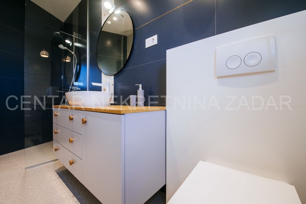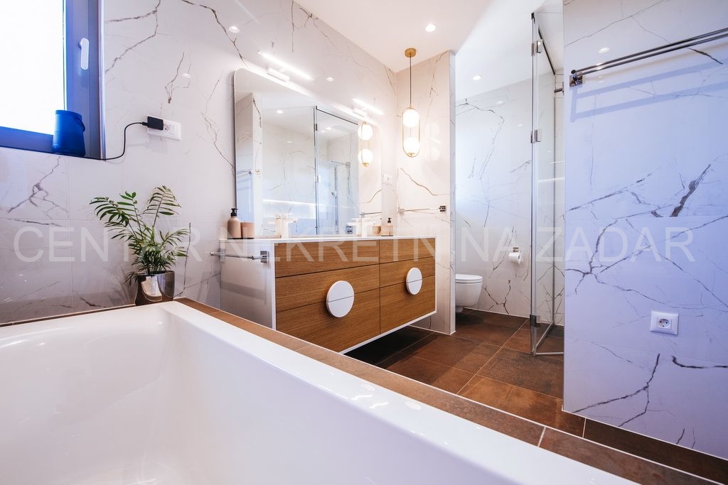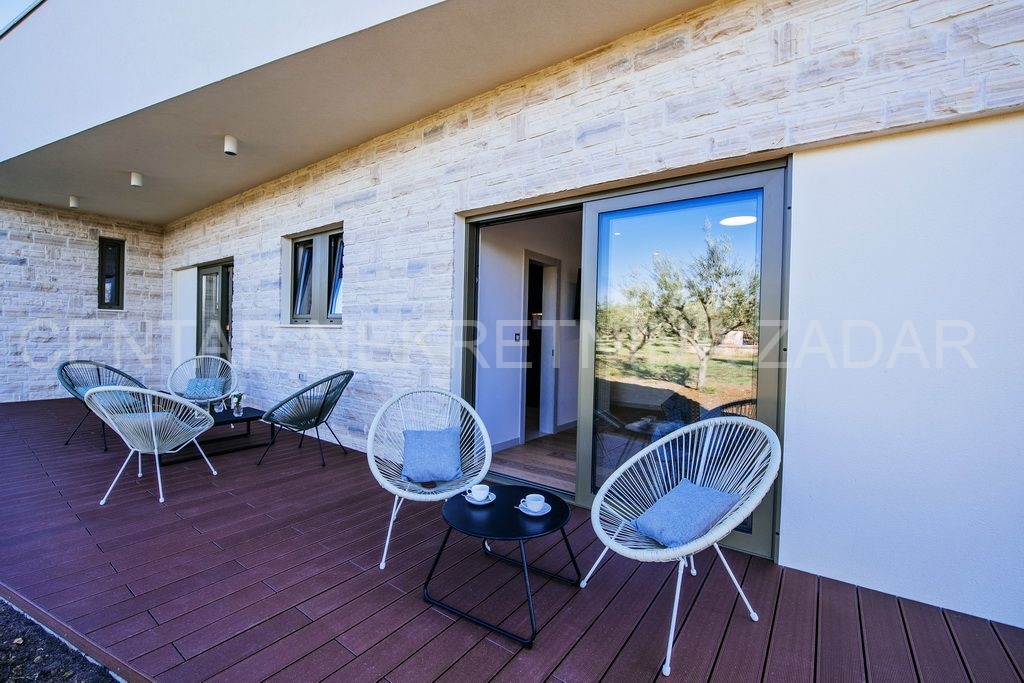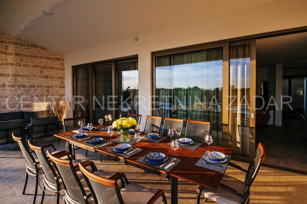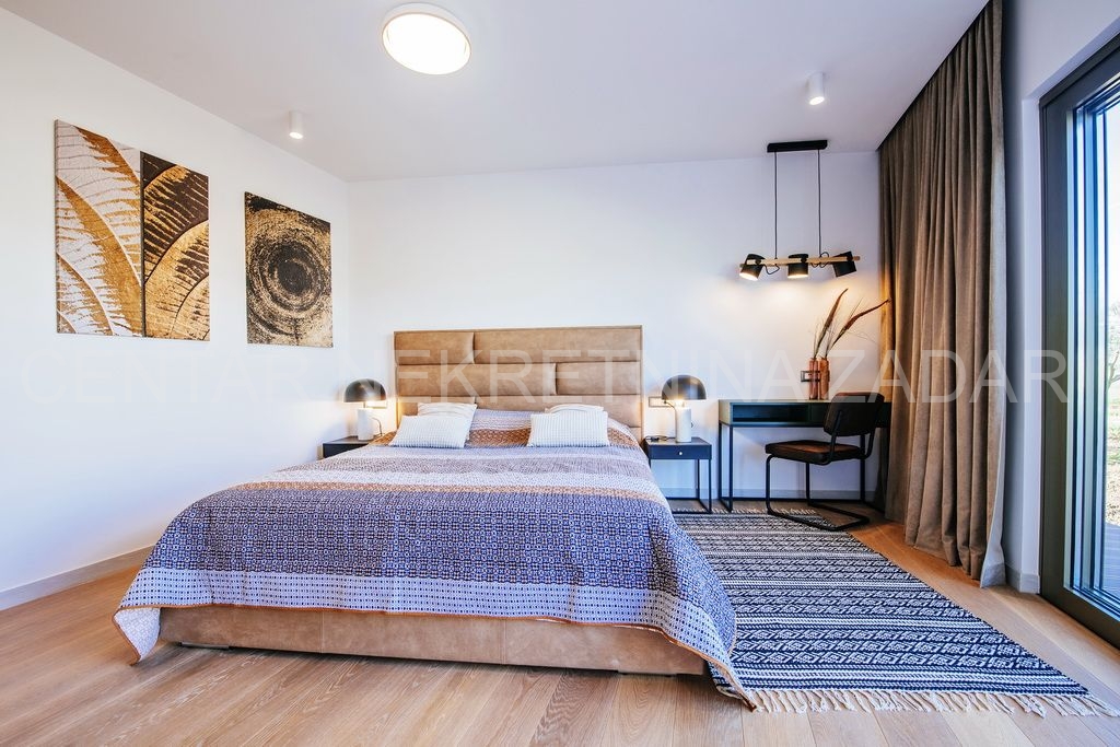 Na prodaju je jedinstvena novoizgrađena, moderno opremljena luksuzna vila sa bazenom u naselju Smoković, nedaleko Zadra. Izgrađena je na zemljištu ukupne površine 2850 m2. Ukupna stambena površina iznosi 276 m2, ima prostranu kuhinju, blagovaonicu i dnevni boravak, wc, praonicu te ukupno 5 spavaćih soba s vlastitim kupaonicama, opremljenim skupocjenom keramikom i sanitarijama te pomno odabranim namještajem izrađenim po mjeri. Dnevni boravak ima izlaz na veliku terasu pored bazena dimenzija 11x5, gdje se također nalazi vanjski tuš, jacuzzi te prostor za zabavu. Ispod bazena smještena je strojarnica bazena, a u sklopu tog prostora može se urediti i sauna ili teretana. Pored bazena nalazi se dodatni objekt u kojem je smješten prostor za roštilj sa wc-om, spavaća soba s kupaonicom te spremište. U sklopu kuće nalaze se i dvije garaže.