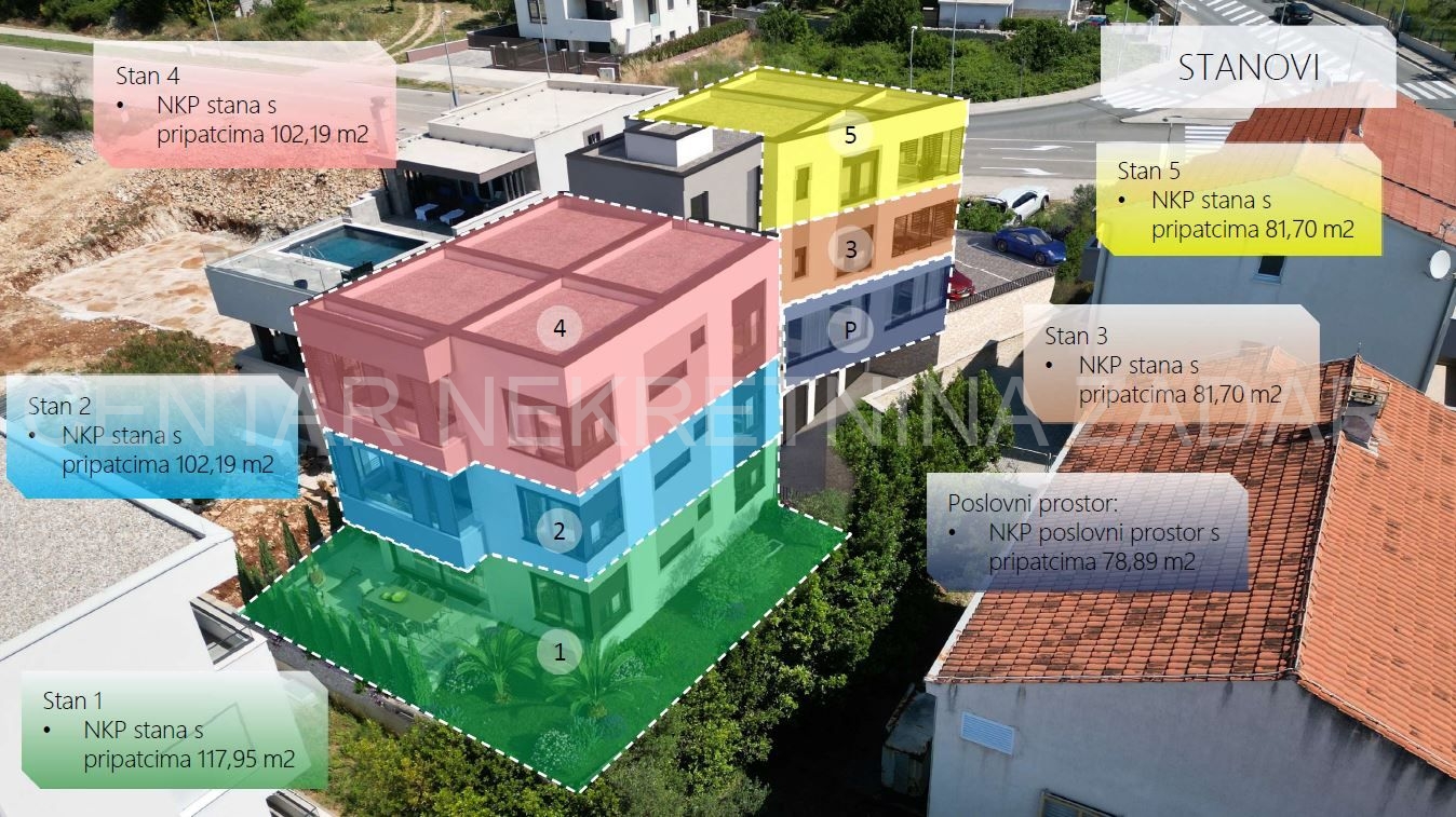 U modernoj zgradi dvokatnici je pet stambenih jedinica i jedan poslovni prostor.