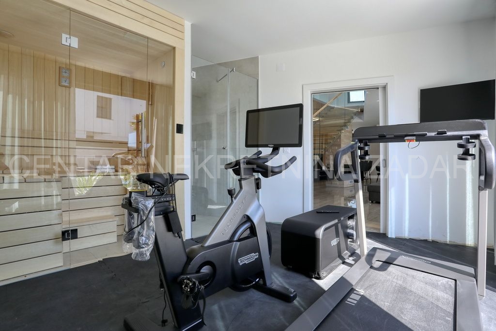 U prizemlju su ulazni dio, toalet, praona, hodnik, kuhinja (15 m²), ostava, blagovaona (22 m²), dnevni boravak (32 m²), sauna i teretana. Dnevni boravak je velikim staklenim stijenama odijeljen od prostrane terase s roštiljem. Terasa se nastavlja na sunčalište uz grijani bazen (8x4 m) s protustrujnim plivanjem, a tu je i vanjski tuš. Moderno stepenište vodi na kat na kojem su četiri prostrane spavaće sobe (14-16 m²) s vlastitim kupaonicama (4-6 m²) i izlazom na lođu od 21 m² uz koju se nalazi zeleni krov.