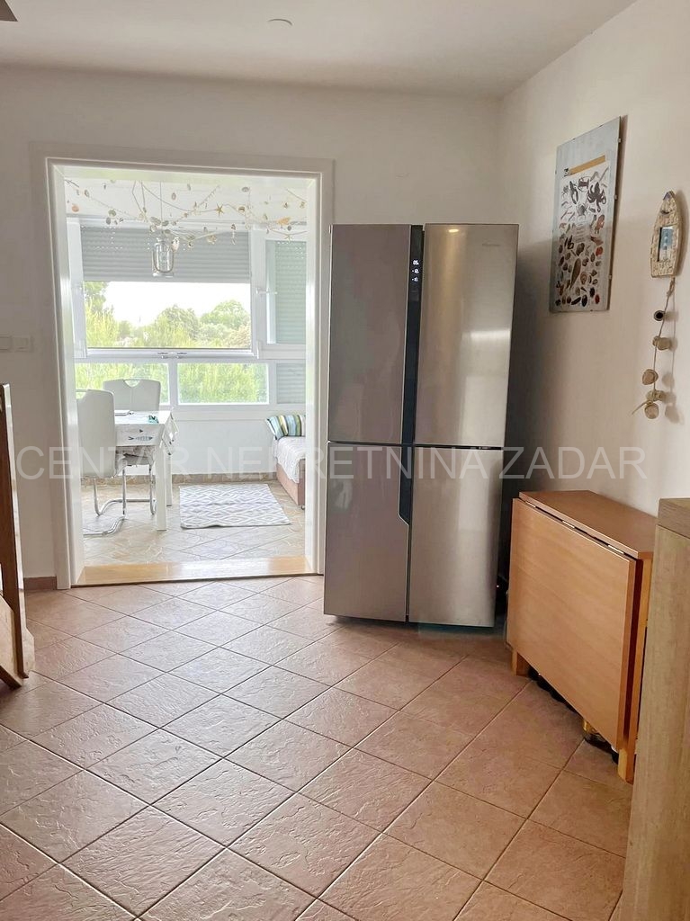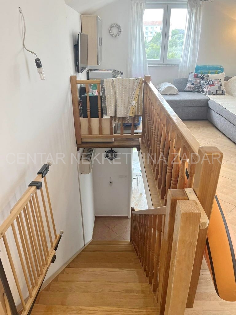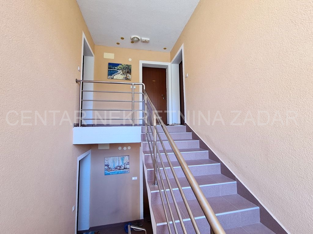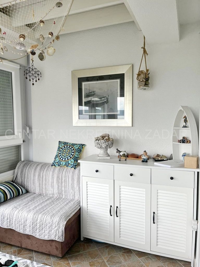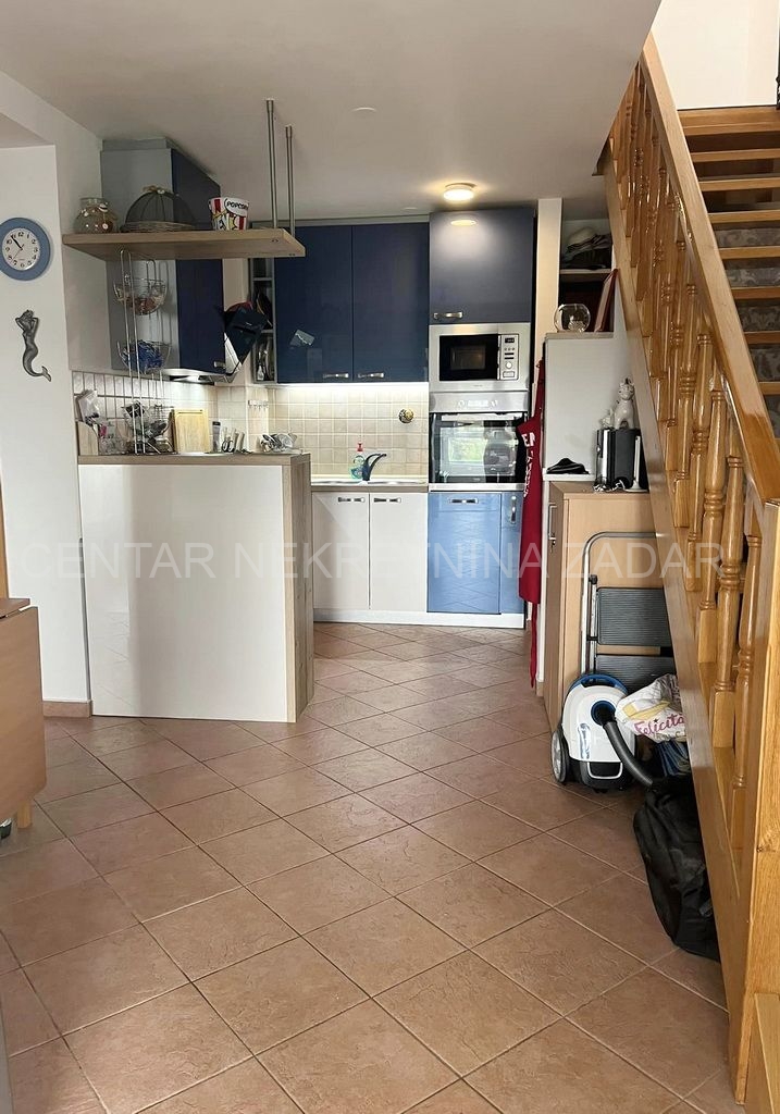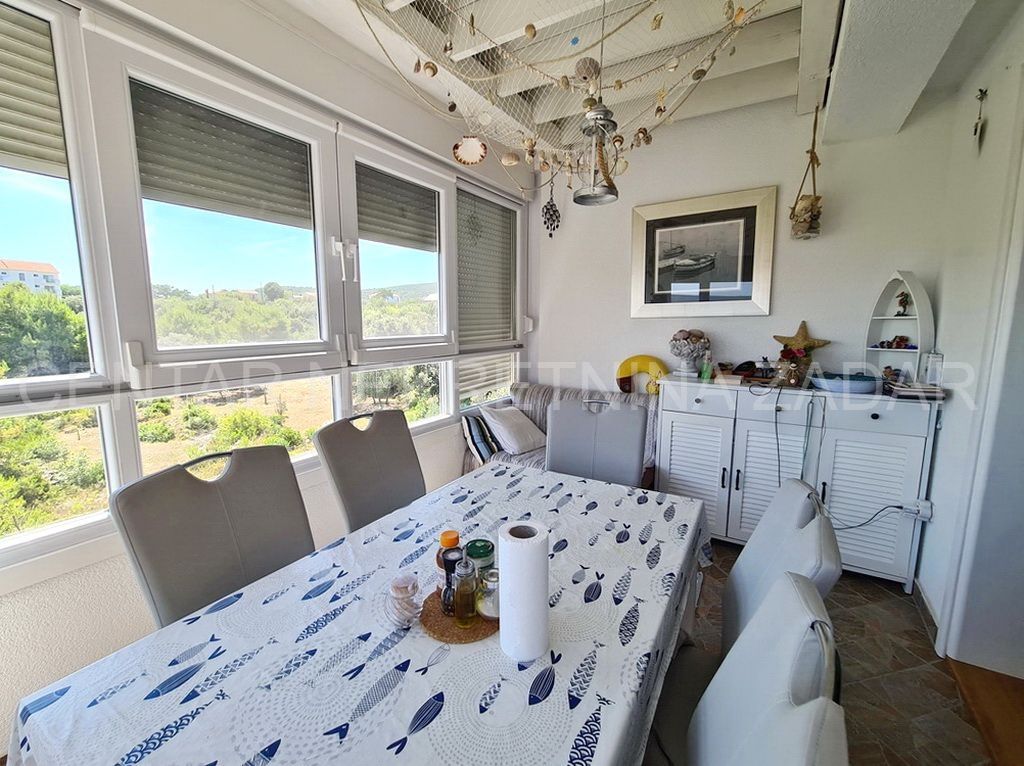 Prodaje se potpuno uređeni dvoetažni apartman u Dobropoljani, smješten na drugom katu zgrade u blizini mora i plaže. Na donjoj etaži su predsoblje, kuhinja, dvije spavaće sobe, kupaonica i velika ostakljena terasa s koje se pruža pogled na more. Na gornjoj etaži je velika prostorija u kojoj je dnevni boravak, a po potrebi se može urediti i treća spavaća soba. Dnevni boravak ima izlaz na terasu natkrivenu pergolom. Apartmanu pripada jedno parkirno mjesto pa ukupna korisna površina iznosi 61,06 m².
