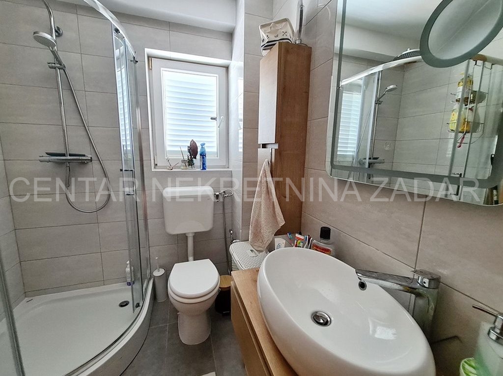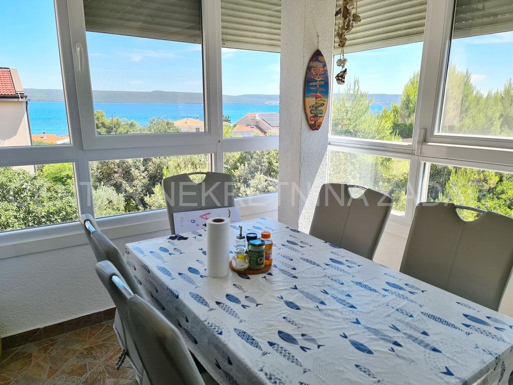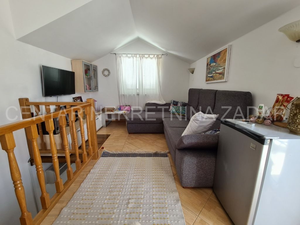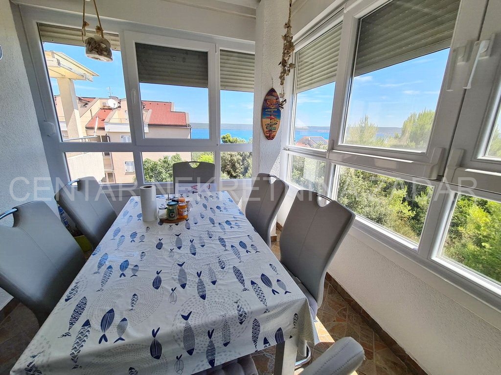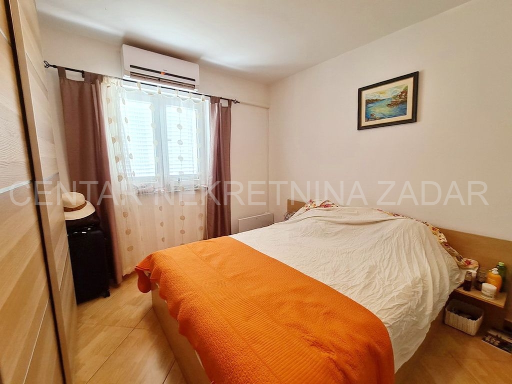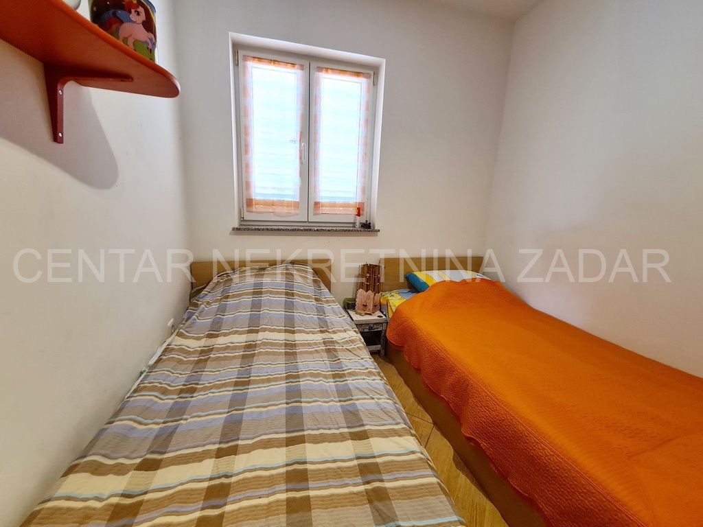 Prodaje se potpuno uređeni dvoetažni apartman u Dobropoljani, smješten na drugom katu zgrade u blizini mora i plaže. Na donjoj etaži su predsoblje, kuhinja, dvije spavaće sobe, kupaonica i velika ostakljena terasa s koje se pruža pogled na more. Na gornjoj etaži je velika prostorija u kojoj je dnevni boravak, a po potrebi se može urediti i treća spavaća soba. Dnevni boravak ima izlaz na terasu natkrivenu pergolom. Apartmanu pripada jedno parkirno mjesto pa ukupna korisna površina iznosi 61,06 m².